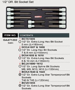 Bao gồm 24 chi tiết 1/2: | Vít lục giác 2 phần dài BCTA size: 1/2″x5mm Vít lục giác dài BCEA size: 1/2″x7,8mm Vít lục giác dài BCIA size: 1/2″x6,10mm Vít sao lỗ dài BCKA size: 1/2″xT40,T45 Vít sao lỗ dài BCVA size: 1/2″xT55 Vít bông dài BCJA:1/2″xM6,M8,M10,M12 |